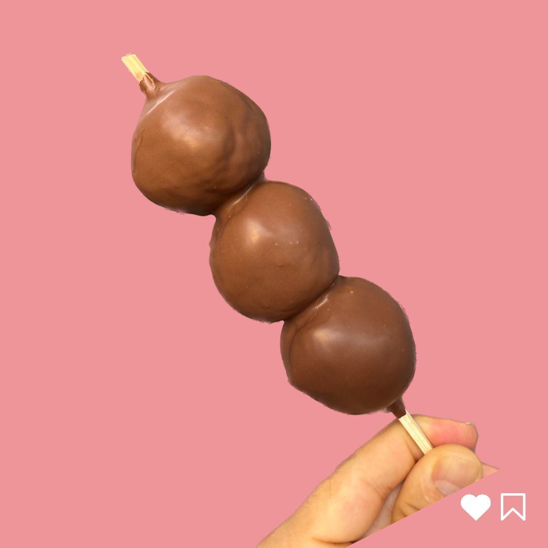 Delicioso espetinho com 3 morangos cobertos com brigadeiro de ninho e banhados em chocolate meio amargo.