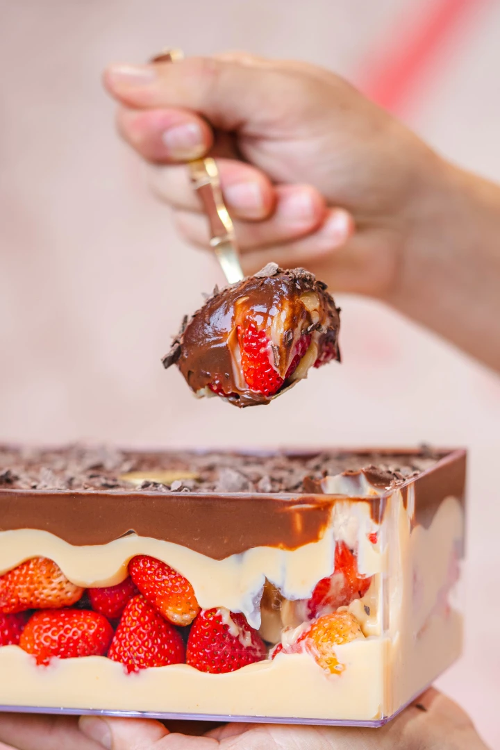Creme de Ninho com chocolate, morangos frescos e cobertura irresistível. Clássico, cremoso e refrescante.
