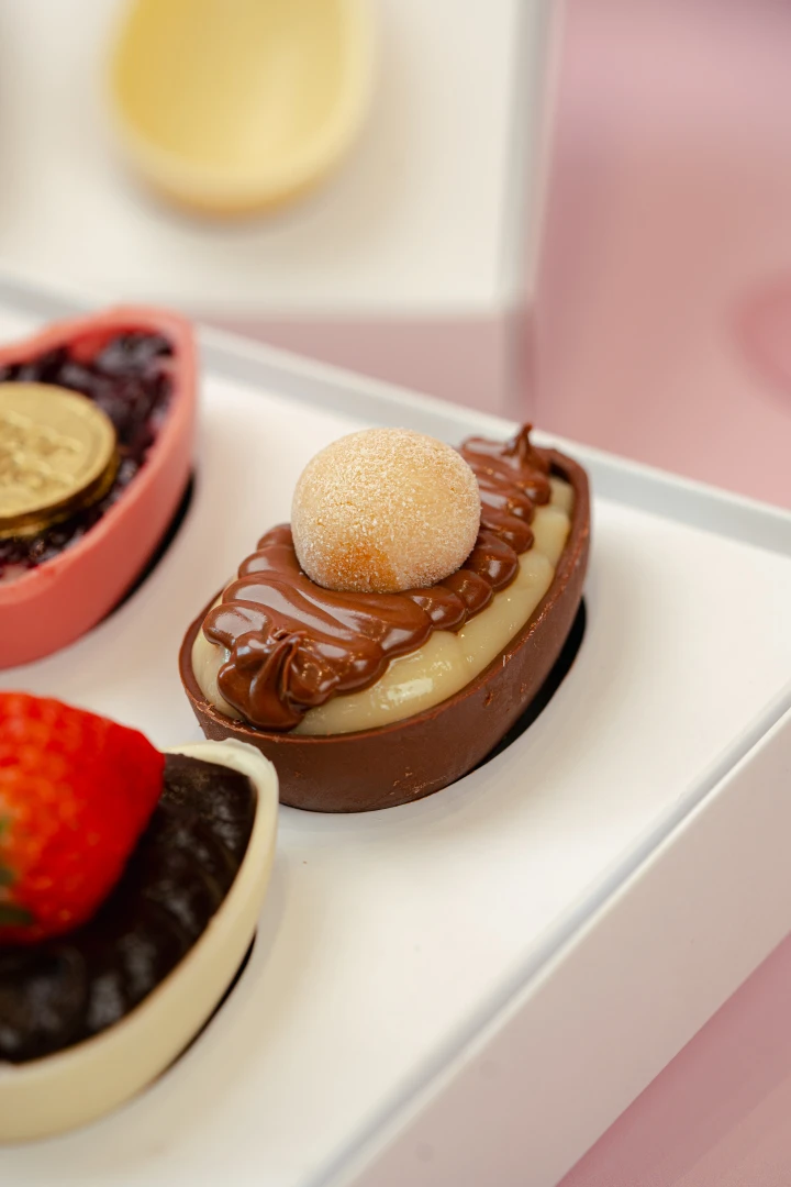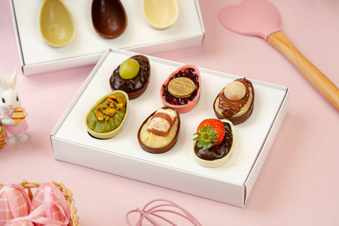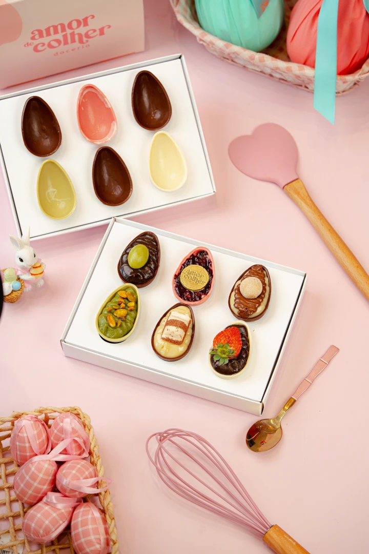 O kit vem com 6 mini ovos recheados, cada um com uma combinação especial: brigadeiro belga com uva, puro pistache, Kinder com Ninho e Nutella, bombom de morango, Ninho com Nutella e rubi com frutas vermelhas.