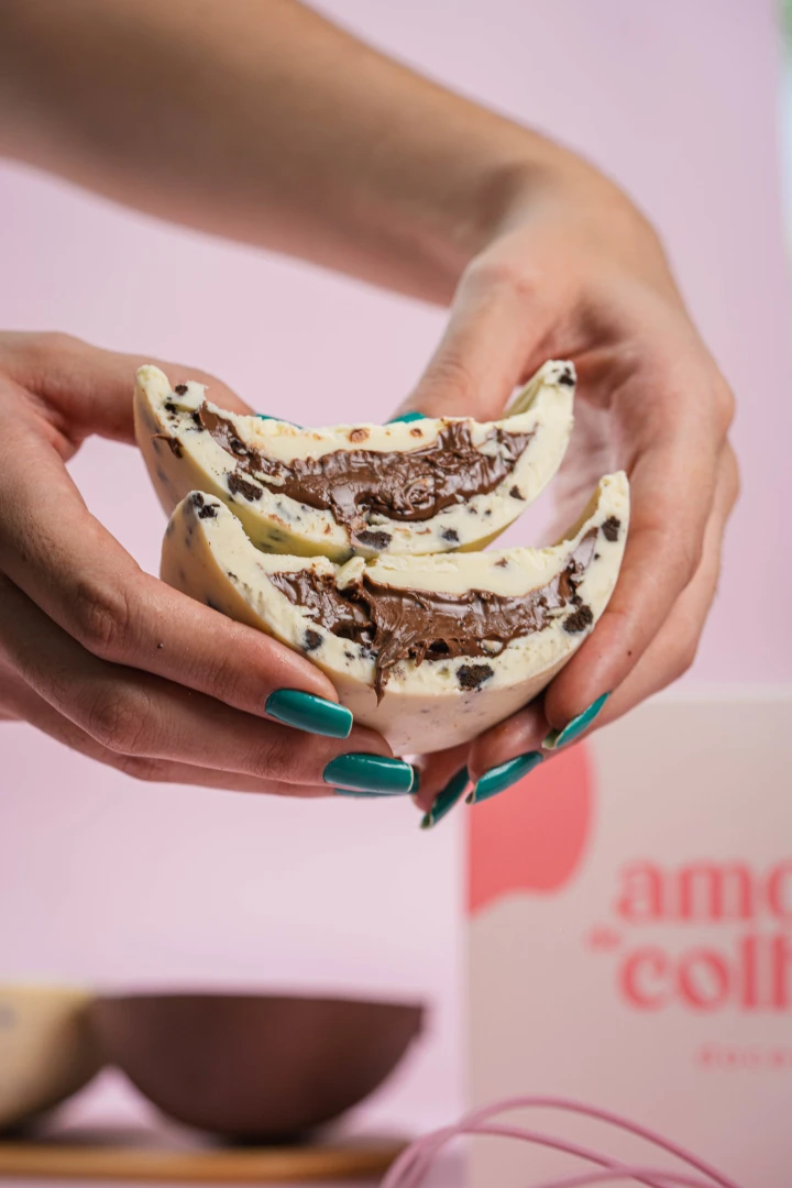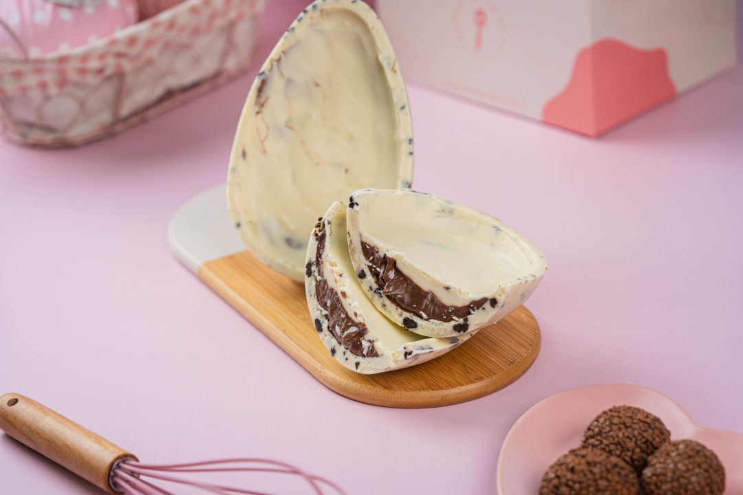 Casca de chocolate branco com pedaços de bolacha Oreo que dão crocância, recheada com uma generosa camada de Nutella cremosa. Uma combinação irresistível para quem ama chocolate e muito recheio. 😍
