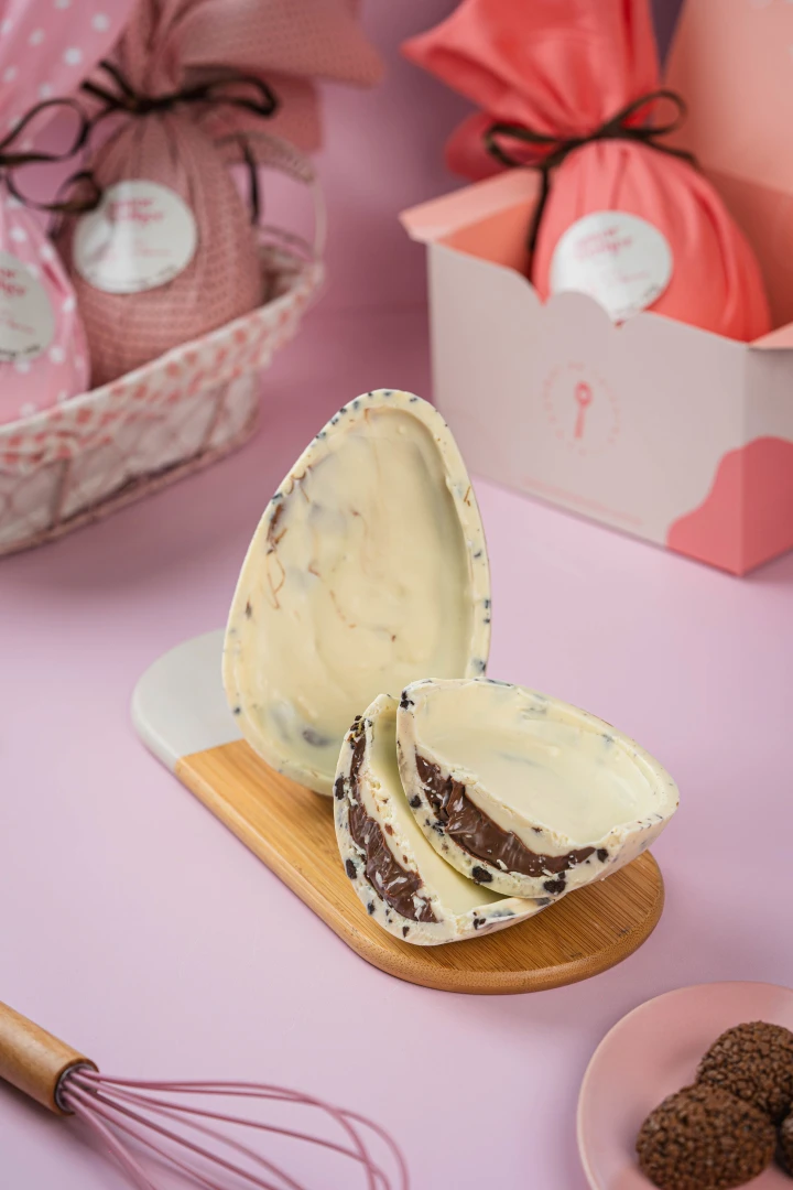 Delicado e irresistível! Ovo feito com chocolate rubi, naturalmente rosado e levemente frutado, recheado com um creme super cremoso de Ninho e geleia de frutas vermelhas bem azedinha, que traz o equilíbrio perfeito entre o doce e o ácido.
