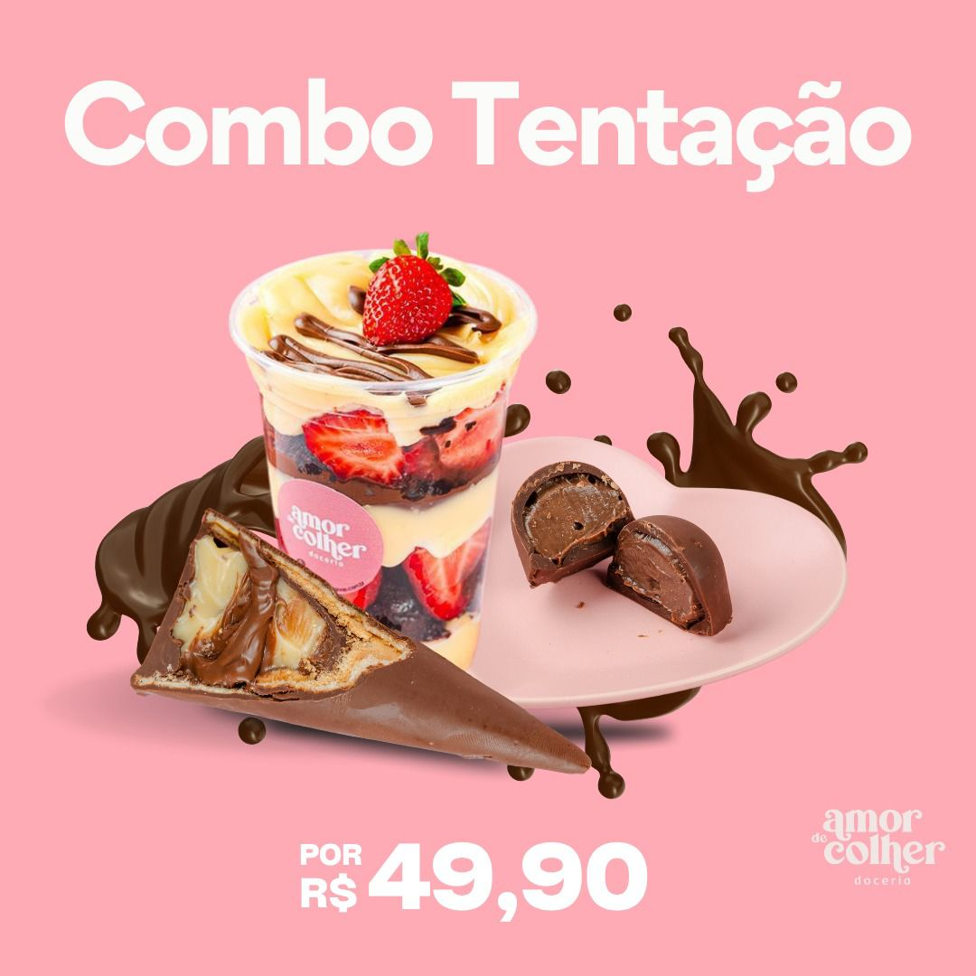 Esse combo é perfeito para quem ama os doces da Amor de Colher e quer experimentar o melhor que temos a oferecer por um preço tentador. leve 1 Copo da Felicidade Tentação de Brownie, 1 Cone Trufado e 1 Trufa e tenha um momento doce.